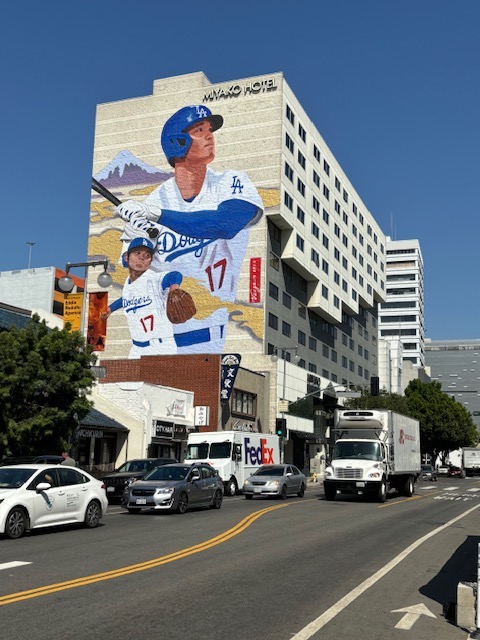 今回滞在したのは、リトルトーキョーにある「ミヤコホテルロサンゼルス」です。ホテルの外壁にはシーズン開幕に合わせて大谷選手の壁画が描かれており、ロビーや屋外にあるQRコードをスキャンすると大谷選手が動き出すAR体験が楽しめるイベントが実施されていました。この壁画を見に来た日本人も多かったです。