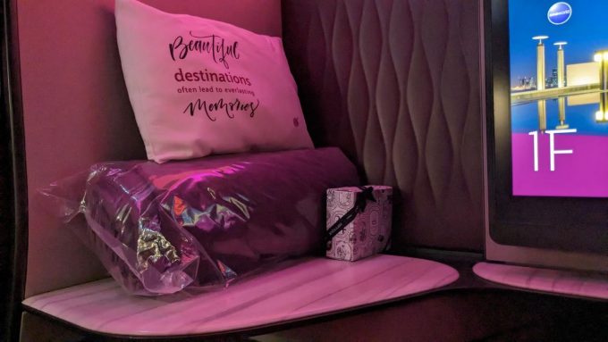 今回、カタール航空のビジネスクラス“Qスイート”で成田を出発しました。Qスイートの座席はライティングが紫でムーディな雰囲気。アメニティはボディローション、リップバーム、フェイスローション、トワレまでついていて、さらに靴下、アイマスク、耳栓入り。パジャマまで配られて、至れり尽くせりでした!