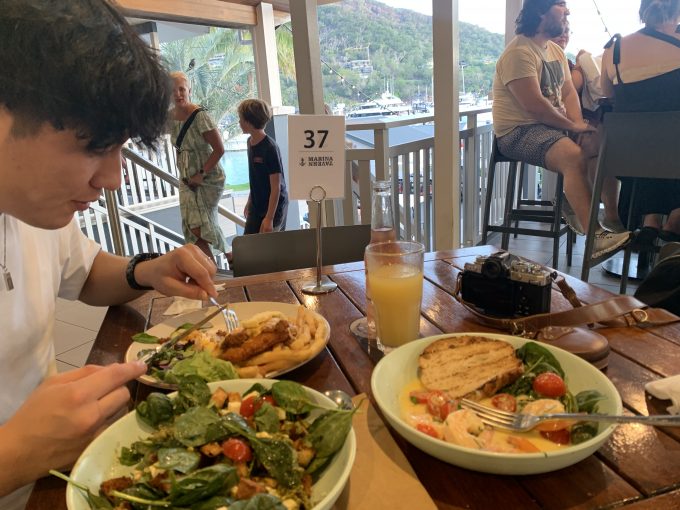 その後もホテルのプールでゆっくりと過ごしたあと、夜はまたまたお気に入りのマリーナ タバーンへ。ステーキとチーズなどがたくさん入ったバジルソースのトマトサラダを食べて、ハミルトン島での最後の夜を締めくくりました。