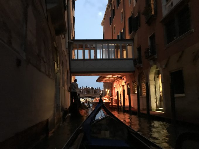 2都市目のベネチアも最高でしたね。実は、ここでゴンドラに乗るタイミングにこだわりがあったのです。夕暮れ時の、もう少しで日が落ちるという時間帯にゴンドラに乗り始め、夕日が沈んで暗くなってからゴンドラ乗り場に戻ってくるという時間帯をあえて選びました。本当にお勧めですので、これから行かれるかたはぜひ、日没時間をネットなどで調べてください。夕日が残っている、まだ明るい時間帯と真っ黒な夜の景色を両方、ゴンドラから味わってほしいと思います。映画で見たことのあるベネチアの街並みを、実際に体験することができて、心から感動しました。