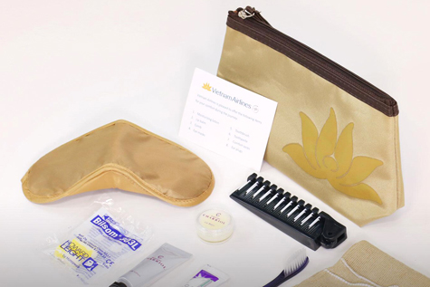 ビジネスクラスでは、リップバームや保湿クリームの入ったアメニティキットをお渡ししています。フランスの有名なデンタルケアブランド「Bucco Therm」のアクア水、お手洗いにはプレミアブランドの化粧品もご用意しています。