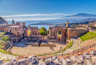 - 古代ギリシア時代に作られ、古代ローマ時代に改築された劇場。劇場跡の美しさもさることながら、エトナ山と地中海まで見渡せる絶景眺望で有名です。