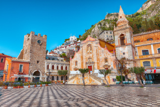 - タオルミーナ旧市街の中心地。カフェやショップが建ち並ぶ華やかな広場です。見晴らしの良い場所にあり、地中海を見下ろす展望スポットとしても人気。
