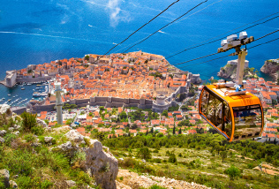 - ドブロブニクの全景を見下ろせる山頂へ。徒歩やタクシーでもアクセス可能ですが、高所から絶景を堪能できるケーブルカーの利用がおすすめです。