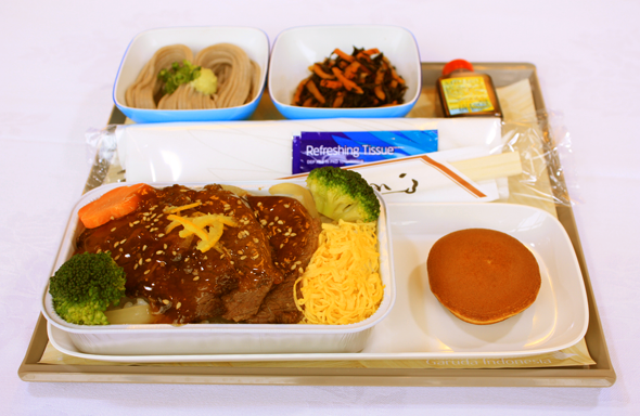 丹精込めて作られた機内食は、エコノミークラスのお客様はインドネシア料理、和食から、ファーストクラス/ビジネスクラスのお客様はインドネシア料理、洋食、和食から選択可能です。エコノミークラスで用意されているインドネシア風のチキン料理や、ビジネスクラスのナシゴレン(焼きめし)やサテ(串焼き肉)など、美味しいインドネシア料理が乗客の人気を集めています。宗教食などの特別食やお子様用の食事や赤ちゃん用の食事なども充実、事前予約で利用可能です。