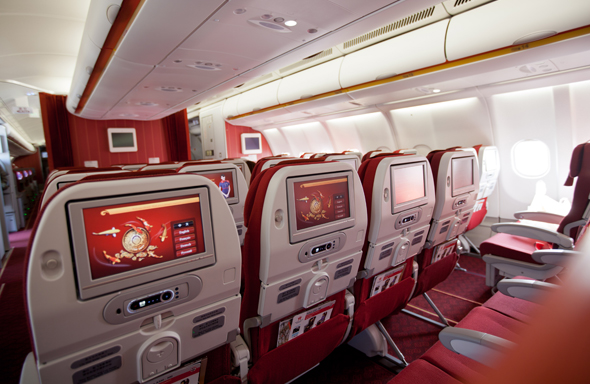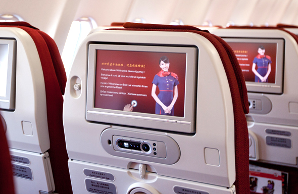日本発着路線のワイドボティ機A330-300、A330-200には、全座席にパーソナルモニターを装備しています。最新の映画やテレビ番組、音楽などをお楽しみください。香港映画はもちろん様々な外国映画の日本語吹き替え版が充実しています。USBの充電ポートも装備しており携帯の充電も可能です。