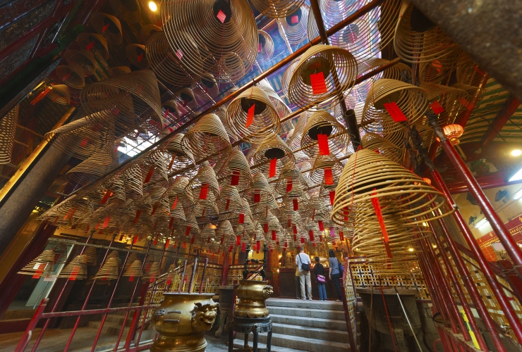 約300年前に建てられた道教のお寺。本殿中央の祭壇には、武将チェ・クンの巨大な像がまつられています。また、回すと幸運が訪れるという銅製の風車があります。幸運をもたらすお寺として、香港の人々に長年愛され続けています。