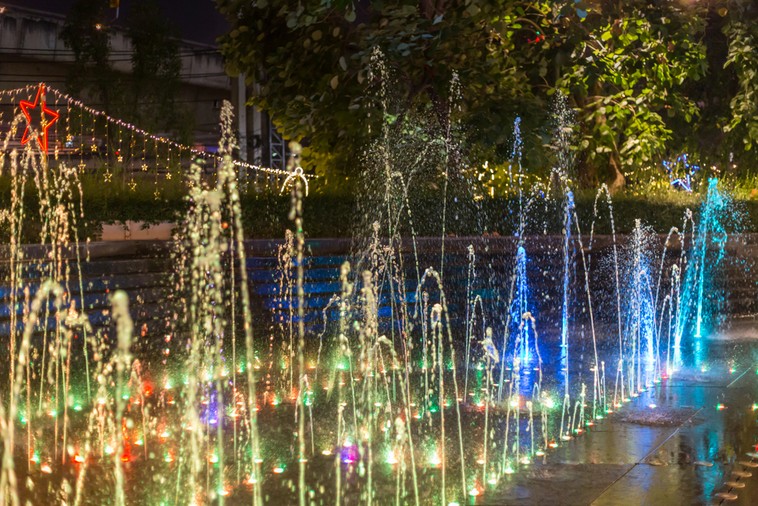 噴水前が記念写真撮影のベストスポットで、夜10時頃までお土産屋さんなどのお店が営業しており、遅くまで人通りが多くにぎやかです。季節のイベントごとに美しい飾り付けが行われ、特にクリスマスシーズンのイルミネーションは圧巻です。