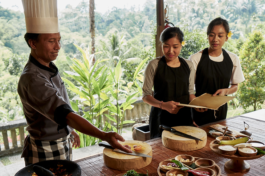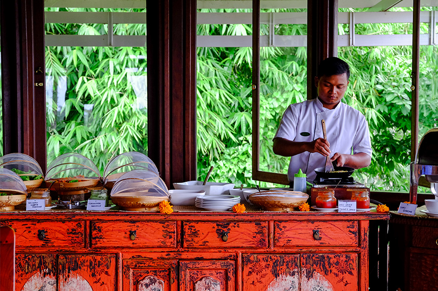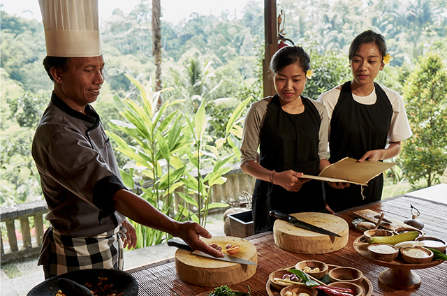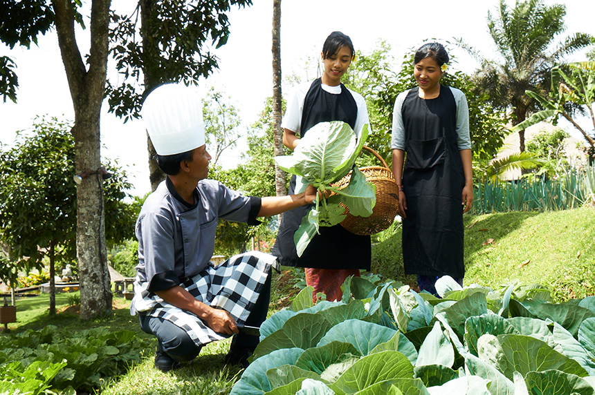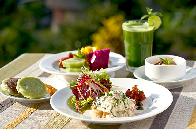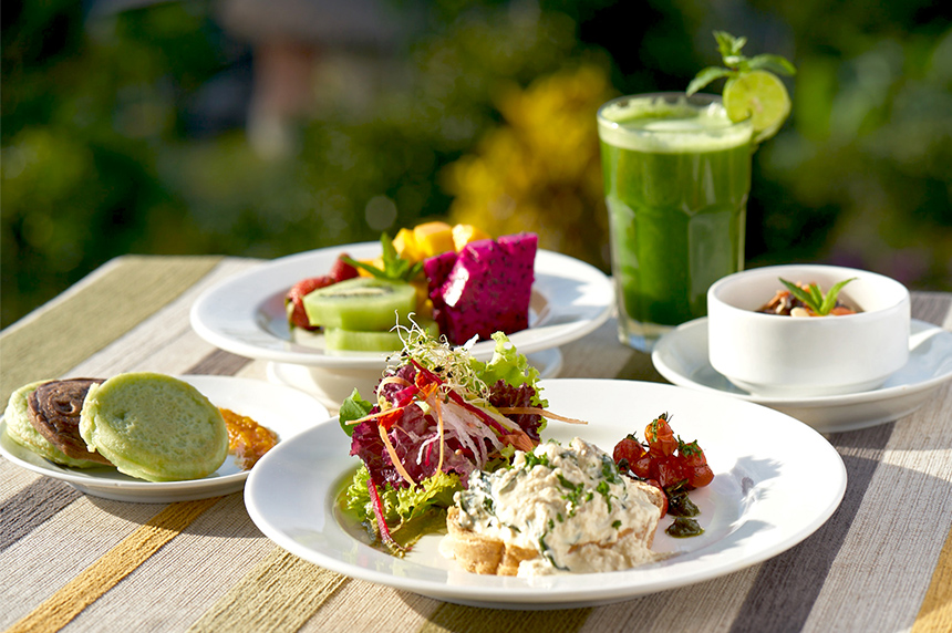 他のリゾートではなかなか見ることがない自家菜園をしている数少ないリゾートで、健康と美に注力しているからこそ食事に関しても食材からこだわっています。大自然の中でマイナスイオンに囲まれたメインレストランでは、リゾート内のオーガニックファームや姉妹リゾート内で採れた新鮮な野菜を使ってのヘルシーメニューをお楽しみいただくことができます。メニューも幅広く、バリ料理やグリル料理の他に、ベジタリアン、ビーガン、グルテンフリーなどの特別メニューもご用意可能です。
