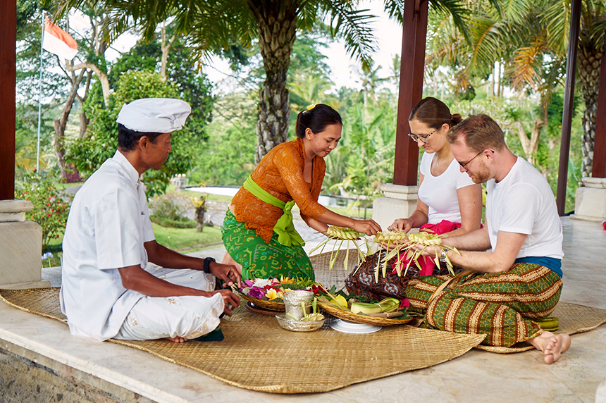 バグース ジャティ ヘルス&ウェルビーイング リトリートは、滞在型リゾートとしてお客様に楽しんでいただくため、無料のアクティビティーを数多く用意しております。毎朝のヨガの他に、1日3種類のアクティビティーが曜日ごとに異なる内容で夕方まで実施されており、瞑想やお供え物作り、バリニーズダンスレッスンなど様々な文化体験が出来ます。これらの無料プログラムだけでも充実していますが、他にも有料プログラムとして大自然の中でのサイクリングやトレッキング、沐浴儀式体験などもご用意しております。