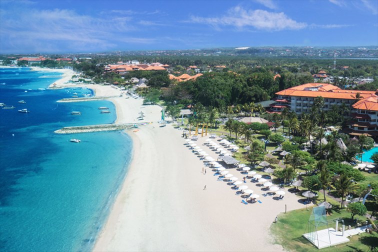 高級リゾートが立ち並ぶことでも知られるヌサドゥアエリアのタンジュン・ベノアという岬の5つ星ビーチフロントリゾートです。空港のあるクタエリアから車で約30分、広大な敷地内には全377室の客室とスイミングプール、9件のレストラン&バー、スパ、フィットネスセンターが完備。プライベートビーチのビーチチェアーではヌサドゥアのビーチを眺めながらのんびり過ごすことができます。