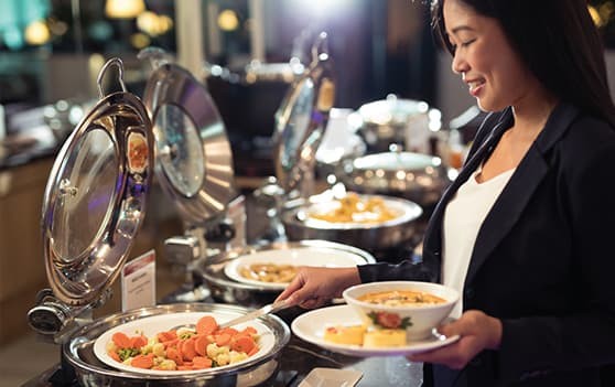 上空では気圧の違いにより地上よりも“薄味”に感じてしまいますが、お客様が最高の味を堪能できるよう、シンガポール航空では味見や味付けはフライト中の機内と同じ気圧に保たれた“疑似機内環境”で行っています。この“疑似機内環境”で試作・試食を行っているのは、数ある航空会社のなかでもシンガポール航空のみ。徹底したこだわりの機内食をご堪能ください。