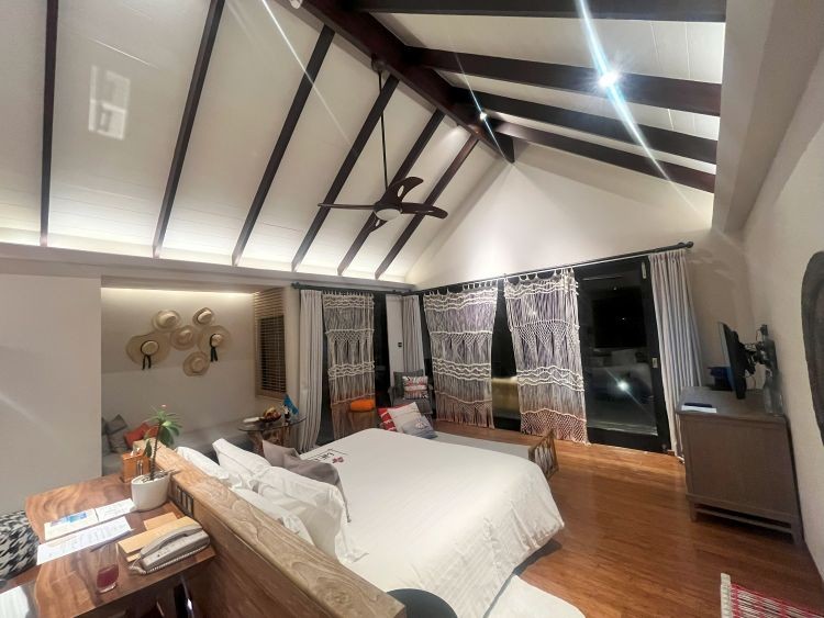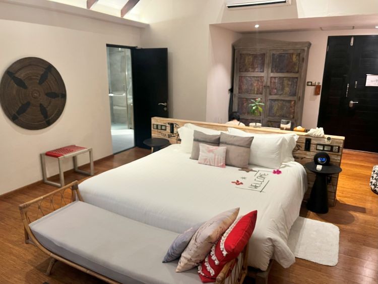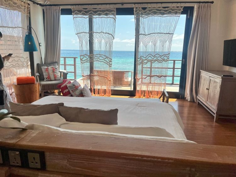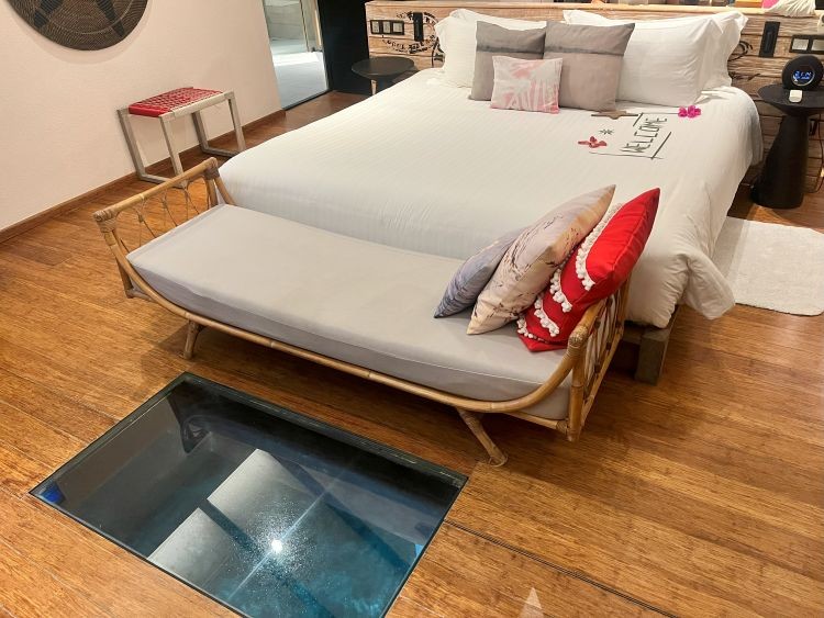 今回はハウスリーフとドロップオフまでの距離が近くシュノーケルにおすすめの「プール付きリーフ水上ヴィラ」に宿泊しました!海が見えるガラス床付きのベッドルームと、バスルームに分かれています。カーテンや壁に掛かっているインテリアが可愛らしく、思わず写真を撮りたくなるようなお部屋でした。