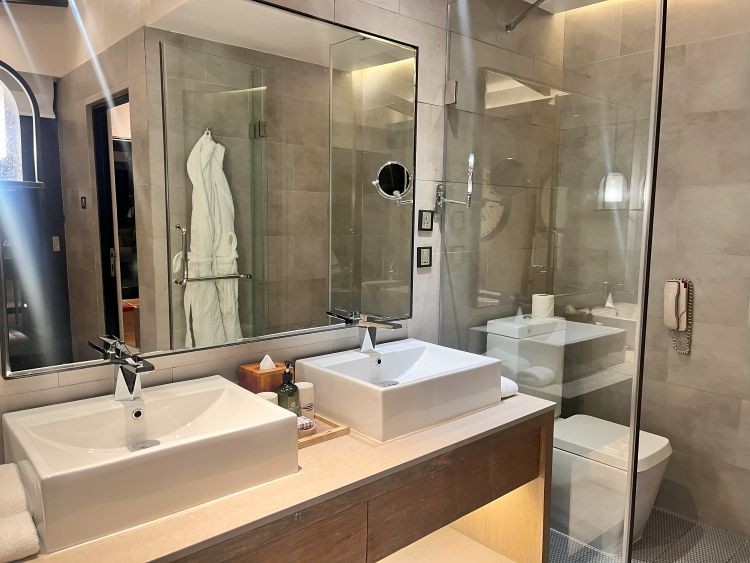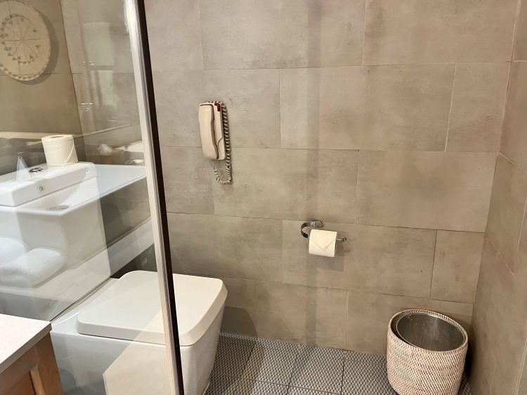 バスルームにはバスタブがあり、シャワーブースとトイレはそれぞれ仕切りで区切られています。洗面台が2つあるので順番待ちのストレスがありません。テラスと繋がっているので、お部屋周りでシュノーケルを楽しんだあとも、お部屋を濡らすことなくシャワーを浴びることができます。