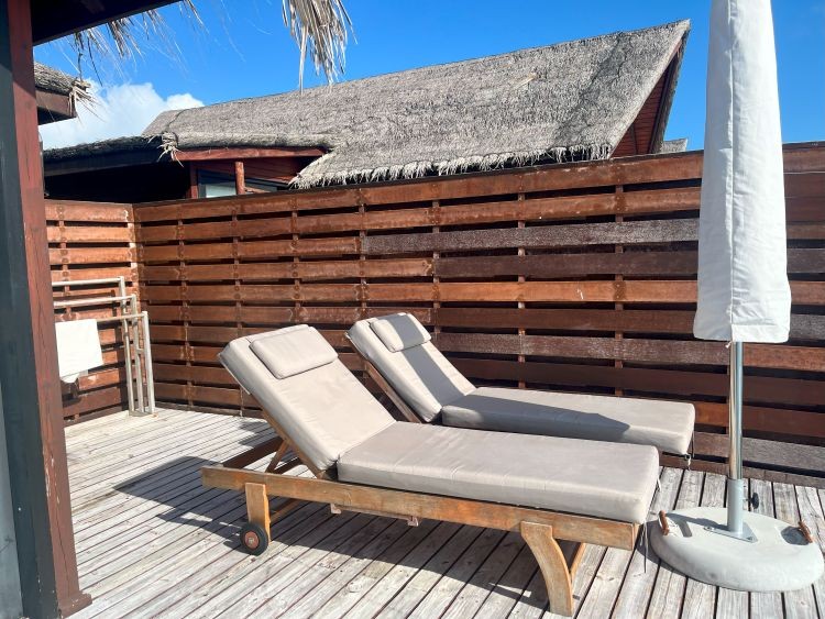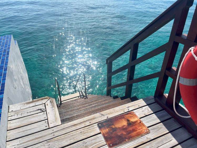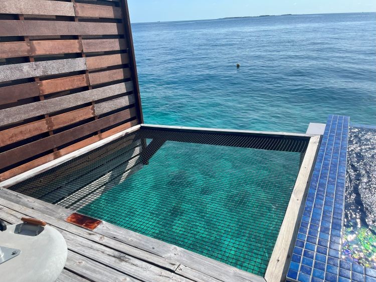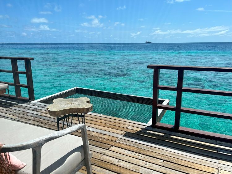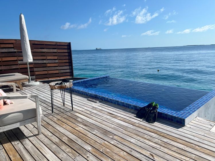 プライベートプールと海上に浮かぶハンモック、デイベッドとパラソルが設置されています。ハンモックはしっかりした造りで、大人2人で乗っても大丈夫でした!海へ降りる階段もありますので、お部屋からシュノーケルを存分に楽しむことができます。