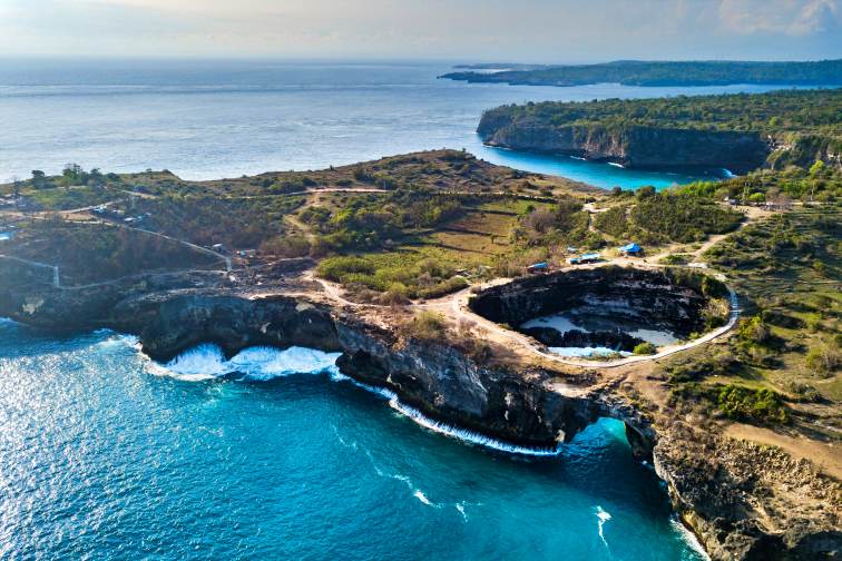 エンジェルズ ビラボンから徒歩5分ほどの場所に位置する「ブロークン ビーチ」。大地と岩壁に穴が開いている不思議な風景を見ることができます。ドローンなどで空中からみると、クレーターのようにぽっかりと穴が開いているのがわかりますよね。