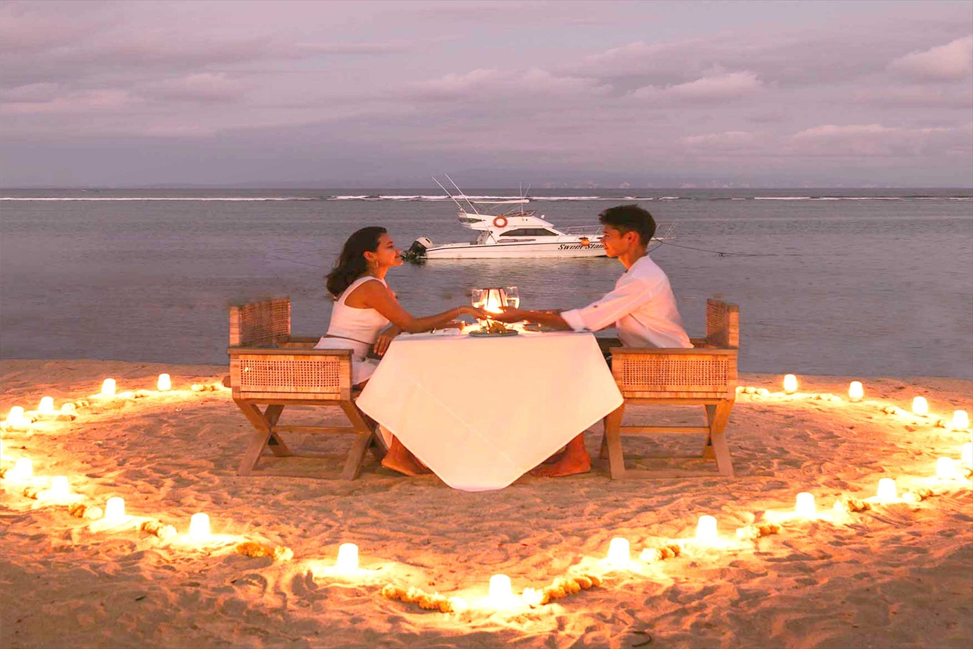 サダラ ブティック ビーチ リゾートの目の前に広がるビーチで、ロマンティックなディナータイムをお楽しみいただける「キャンドルライトディナー」を滞在中に1回プレゼント♪カップル旅行や記念日旅行、お友達との旅行の記念にもお勧めです。キャンドルでロマンチックなセットアップをご用意し、4コースディナー&モクテル1杯をお楽しみいただけます!さらに、「60分間のバリニーズマッサージ」と「プールバーでのドリンク1杯券」の特典もご用意しておりますので、超お得なホテル滞在ならサダラ ブティック ビーチ リゾートへ!!