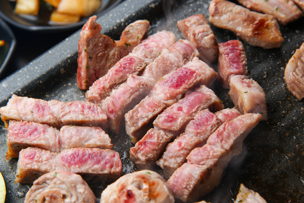 店の熟練のスタッフが、くさみのない新鮮な済州の黒豚肩肉を分厚くきってじっくりと時間をかけて焼いてくれます。最高においしいタイミングでカットしてお皿に盛ってくれるので肉汁たっぷりのサムギョプサルを思う存分堪能するのみ!