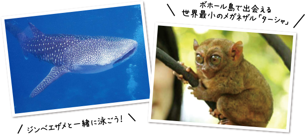 せっかくセブ島へ行くならオプショナルツアーに参加して、セブ島でしかできない体験を!ジンベイザメと一緒に泳ぐオプショナルや、おとなりの自然溢れる「ボホール島」への日帰りオプショナルなどが大人気!