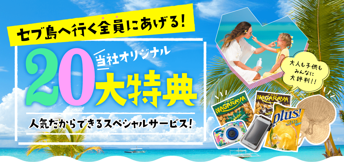 オリジナル20大特典をご用意しました!どこよりもオトク&快適にセブ島へレッツ・ゴー!