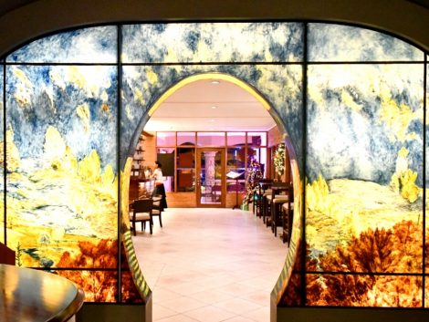 夕食はネオンに光る看板に惹かれて、ホテル内のパレルモ(Palermo)へ。間接照明だけの店内でキラキラと光るステンドグラスのコントラストが綺麗で印象的でした。“秘密の隠れ家”に来たような気分で、2人だけの静かなプライベートの時間をお楽しみいただけます。