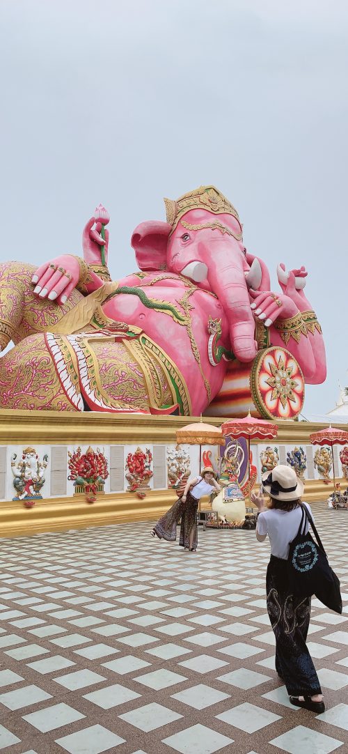 朝6:30頃、ホテルからタクシーで「ピンクガネーシャ(ワット・サマーン・ラッタナーラーム)」へ。予め目的地は決まっていたので、だいたいのタクシー相場を調べておきました。相場に近い値段を言ってくれたドライバーにお願いしようと決めていて、この日お世話になったドライバーさんとはとてもいい巡り合わせ。彼のおかげで2日間に分けて観光しようと思っていたところが、1日で観光できました!ピンクガネーシャに到着すると雨が降っていたのですが、インスタで見かける通りでした。ガネーシャの周りには7つのネズミの像があり、曜日ごとに色分けされているんです。自分の生まれた日の曜日と同じ色のネズミにお願いごとをして、ネズミが私たちの代わりにガネーシャに願い事を伝えてくれるので、事前に自分が生まれた曜日は調べて行ったほうがいいですよ!