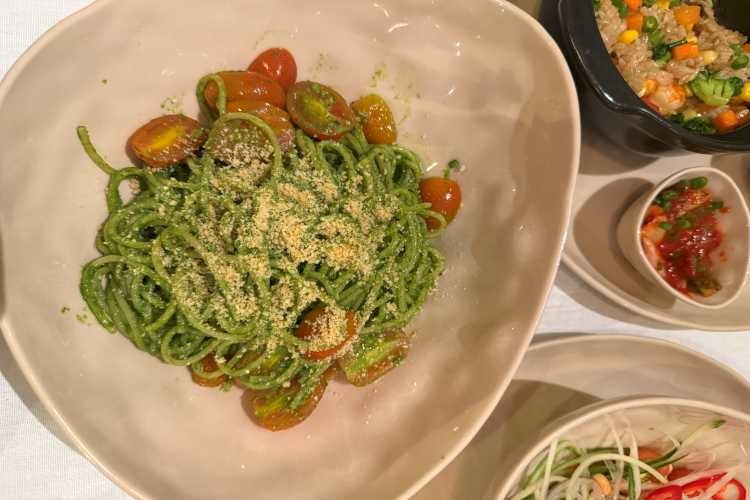 夕食ではサラダにパスタなど頂きました。日本語メニューもあり、料理の説明も記載されているので、とても分かりやすかったです。どれも日本人にも合う味付けでとても美味しかったのですが、特にサラダが新鮮で本当に美味しかったです!