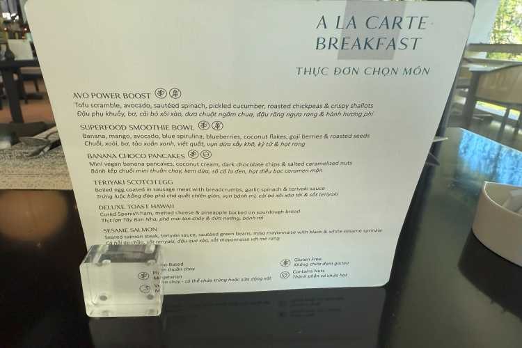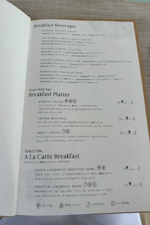 朝食は、飲み物を2つとパンやフルーツなどのサイドメニュー1つ、メインのアラカルトプレート1つメニューから選んでいくスタイルでした。