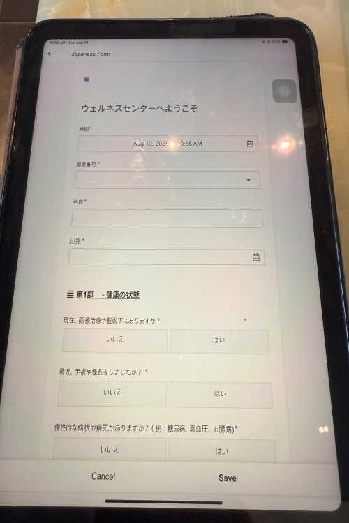 到着時に問診票をタブレット端末に入力しますが、日本語設定になっているので、安心して希望をお伝えいただけます!