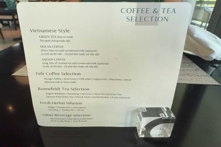 席に案内されたらまずはコーヒーメニューからお好きな紅茶かコーヒーを選び、アラカルトメニューを1つ選びます。その後は各々でビュッフェエリアに行き、好きな料理を取りに行きます。