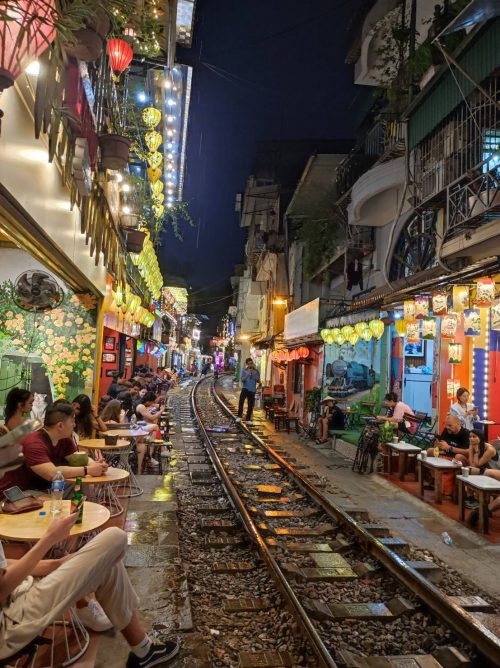 ホテルにチェックイン後は、旧市街の散策へ。ホテル近くのホアンキエム湖まで散歩し、街並みを楽しんだ後、湖周辺のレストランで夕食をとりました。その後は、トレインストリートへと足を運びました。飲み屋街でもあり、昼間よりも夜の方が活気に溢れる場所です。去年同じ場所を訪れた友人からは、事故の影響で入れなかったという話を聞いていましたが、今回は問題なく楽しむことができました。鉄道関係の写真撮影が好きな方なので、毎晩思う存分撮影を満喫しました。