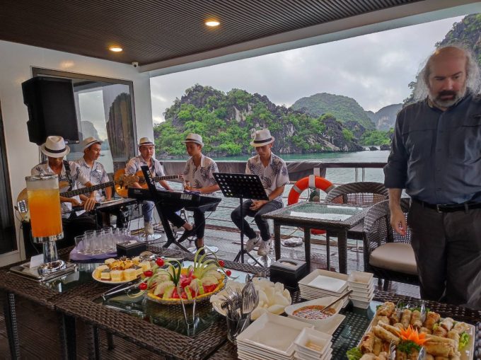 舟で洞窟探訪したり、クルーズ船上ではバンド演奏を楽しんだりと充実した時間を過ごしました。自分で春巻きを作って食べるというクッキングのアクティビティも楽しく、ランチやディナーも大変美味しかったです。雨季だったため乗客が少なく、他の乗客との交流も楽しむことができました。特に、インドから来たカップルとは仲良くなり、共に楽しい時間を過ごすことができました。