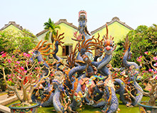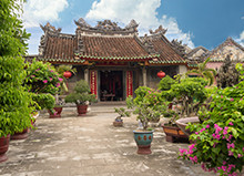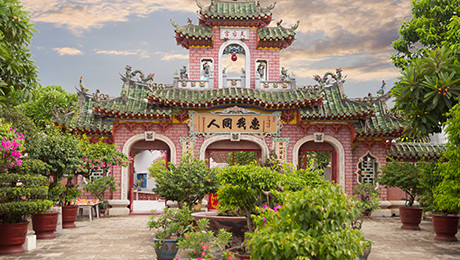 ホイアン最大規模の会館である福建会館は、17世紀に華僑が建てた集会所で現在も福建省出身者を中心に利用されています。ピンク色の目立つ門を抜けて敷地内に入ると、会館内の天井に、ひときわ目を惹く願掛け用の「渦巻き線香」が吊り下げられています。柱や天井の装飾に加え、航海安全の守り神である「天后聖母」などたくさんの見所があります。
