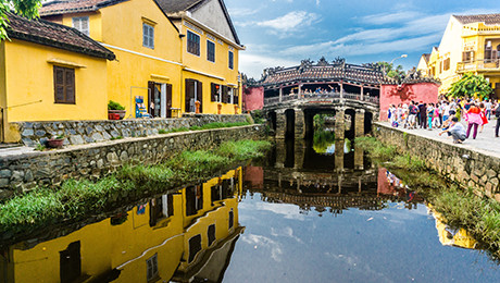400年以上前に架けられた屋根付きの石橋で、2万ドン紙幣のデザインにも採用されているベトナムを代表する名所です。かつて東西貿易の要所として栄えていた時代に日本人によって建設されたとされています。橋の中ほどに建立されたお寺にも参拝可能。毎晩18時から22時までライトアップされ、昼間の厳かな印象とは違った幻惑的な魅力を味わえます。