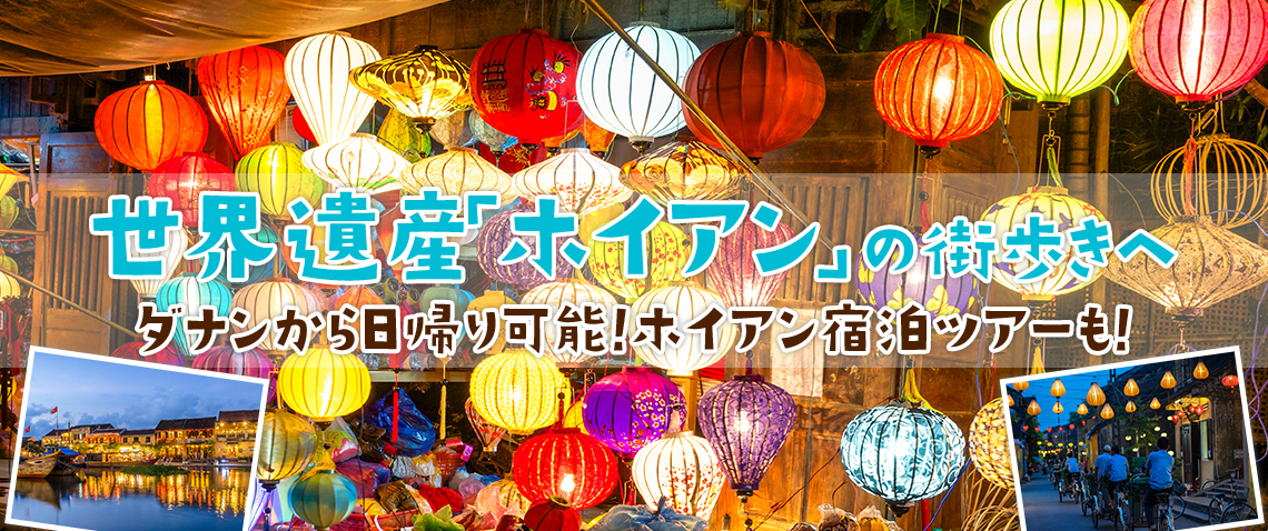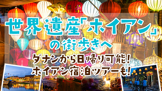 世界遺産の街「ホイアン」。かつて海洋貿易で栄えたホイアン市内には、ベトナム、中国、日本、さらにはヨーロッパの建築様式が混合された街並みが今もたくさん残っており、ここでしか経験できない素敵な街歩きを楽しめます!そしてホイアンの代名詞ともいえる情緒溢れるランタンの灯り。お時間のある方は、美しい夜のホイアンもたっぷり楽しめる滞在ツアーがおすすめです。ダナンから車で約40〜50分なので、日帰りでも訪れる価値あり!