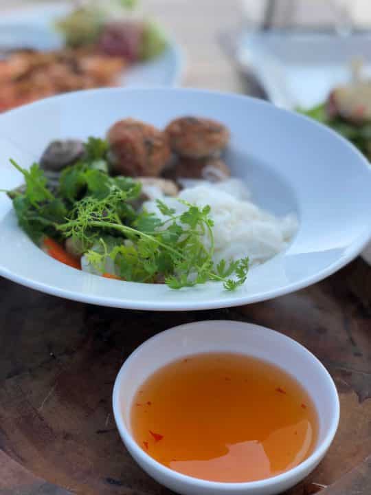 店員さんオススメのヴェトナム家庭料理のBunCha(肉団子の入った米粉つけ麺)、海老の串焼き、シーフード炒飯を注文する。どれも美味だったが、BunChaの甘酸っぱウマさが斬新で格別だった。
