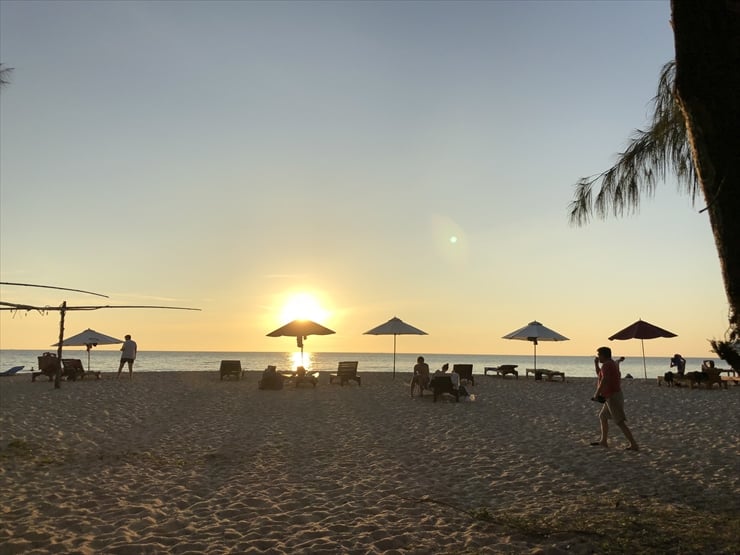 この時に乗ったタクシーがまぁ酷かった。カフェのスタッフが運転手に行き先を説明してくれたのだが、英語も話せず、道もわからず、しまいには誰かの私有地で勝手に降ろされた。自分の方向感覚だけを頼りに、コテージリゾートの敷地内の階段をくだり、ダイニングの横を通り、どこにいるか分からない自分達が何だか不安で楽しかった。そして絶妙なタイミングで辿り着く。赤いパラソルが均等に並んだ砂浜が、金色に照らされていた。昨日とはまた違う顔の夕日。上品で大人な輝きだった。