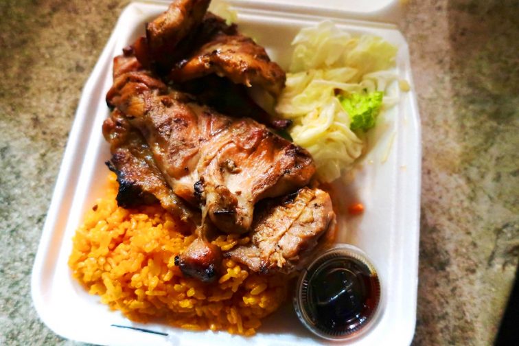 串焼きBBQを単品買いするのも良いですが、チャモロ料理のレッドライスやサラダなどがセットになった、コンボメニューもおすすめです。大ぶりのチキンBBQに、ジンジャーと醤油、レモンを絞ったグアムのオリジナルソース「フィナデニソース」を付けて食べるのがローカルスタイル。