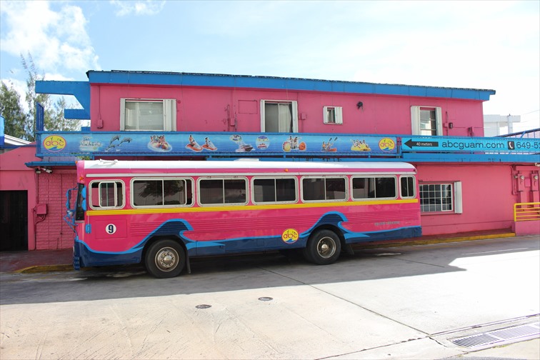 訪れたのは「Alupang Beach Club Guam USA(アルパンビーチクラブグアムUSA)」。ピンクの可愛らしいバスや建物が目印です。場所はタムニング地区のマリンドライブ沿いにあり、ツアー参加者は無料の送迎サービスを利用することができます。