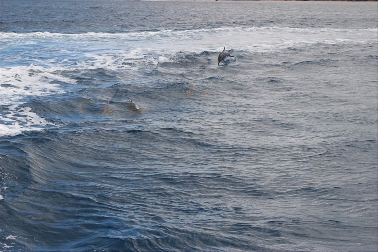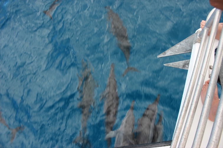 この辺一帯はイルカの遭遇率が非常に高く、ほぼ毎日見つけることができるそうです。好奇心旺盛な野生のイルカたちは自らボートに近づいてきて、自慢の泳ぎやジャンプを披露してくれます。