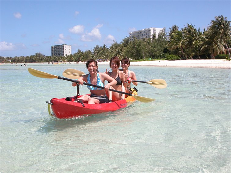 写真に写っているカヤックは、プラスチックでできた丈夫なボートを自分たちで漕ぎ、グアムの海をのんびりと散歩できます。女性3人でも簡単に体験できますよ。