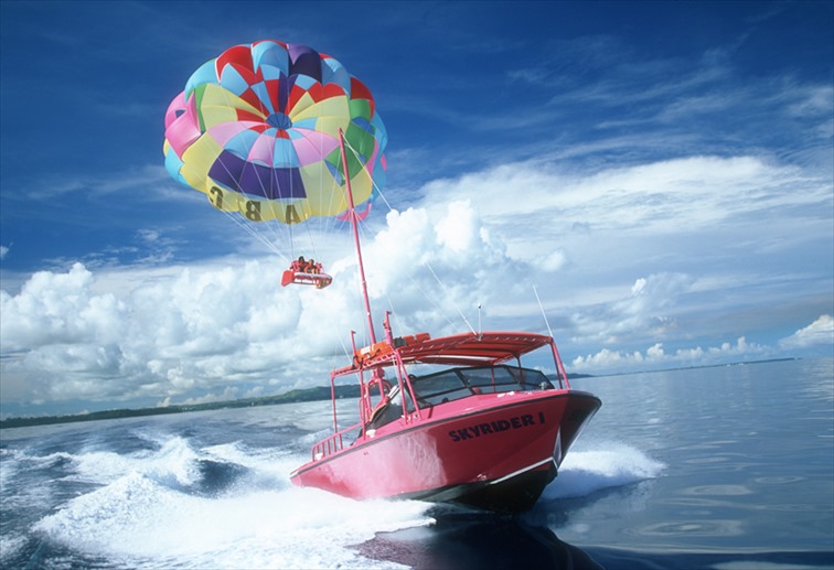 安定感のある二人乗りベンチシートに座ったまま、空中遊泳を楽しめる「パラセイリング」。カラフルなパラシュートがグアムの空に映えますね!猛スピードで走るボートからテイクオフ後は、海上30~50メートルほど浮上し、優雅にグアムの空を満喫できます。筆者も(いつか体験してみたいな~)と思っている、マリンアクティビティです。