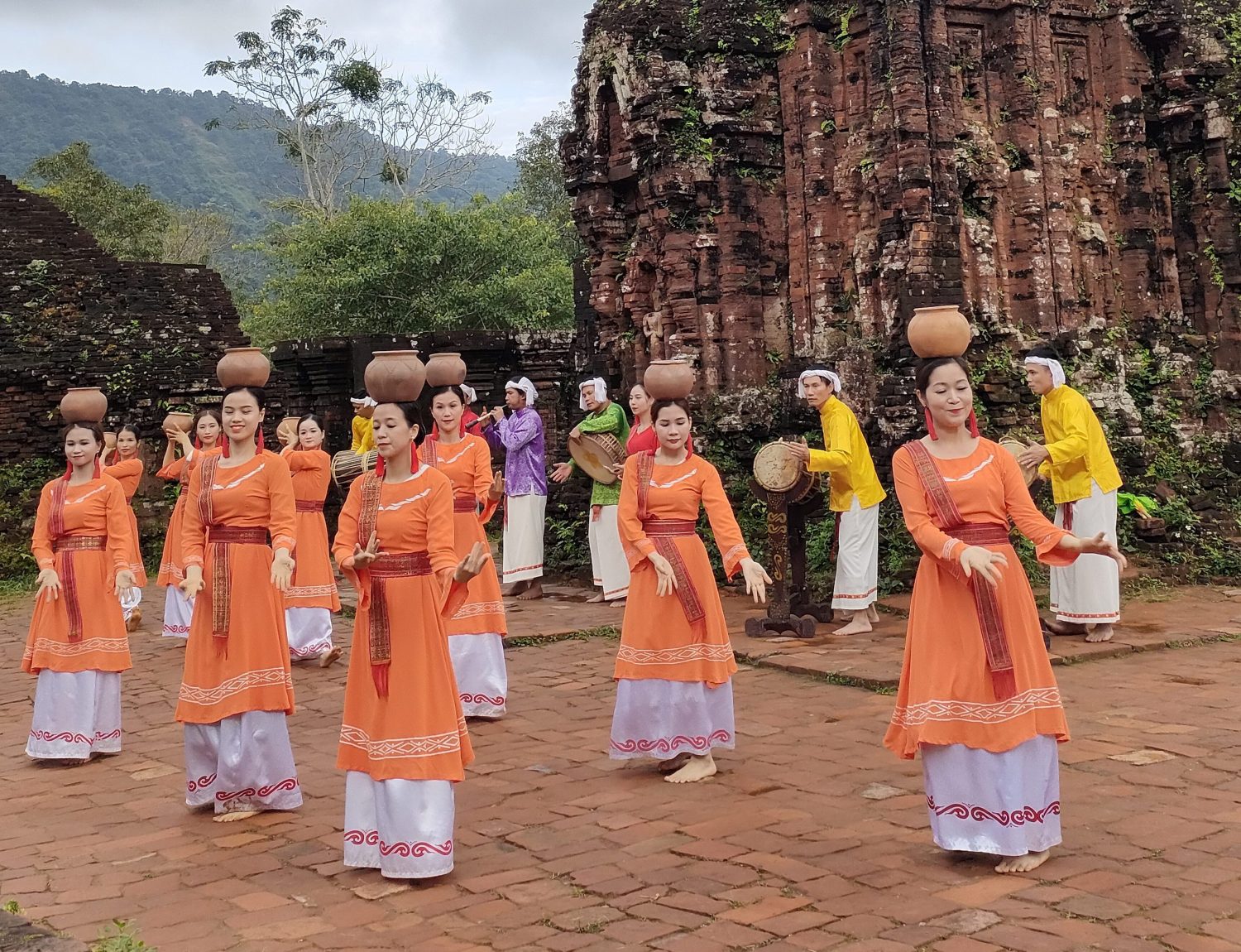 この日は、世界遺産「ミーソン遺跡」を観光しました。ホテルから遠いため、SUV車をチャーターして向かいました。遺跡では、民族踊りや演奏をされてて、子供も楽しんでいました。ベトナム戦争で多くの遺跡が破壊されほぼ残骸で、見物として見られるのは実はちょっとしかありませんでした。そんなこんなで思ったより早く回れたので、午後は予定を変更して、ハン市場へお土産など買いに行くことに。