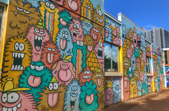 カカアコはアラモアナとダウンタウンの間に広がる、高級コンドミニアムなどが建ち並ぶ地区。元々は自動車整備工場や倉庫街でしたが、ビルや倉庫の壁をキャンバスにした個性的なウォールアートが街中に描かれたことをきっかけに、有名な観光スポットになりました。 アラモアナからスタートして、歩いてアートを巡り、途中でおしゃれなカフェで休憩するのがおすすめ!