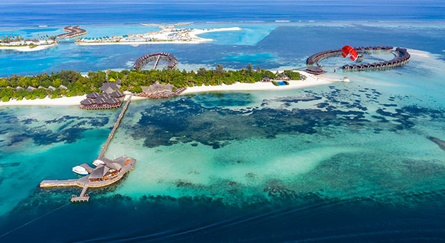 どこからみても美しい広いラグーンに囲まれた5つ星リゾート。水上ヴィラはアーチ状に建てられ、THE・モルディブの景色を満喫できます。空港から近く、スピードボート移動も体の負担が少ないのもポイントです。