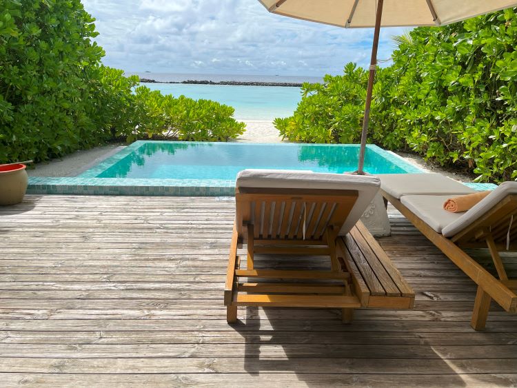 ソファと大きなプライベートプールがあり、その先にはビーチが広がっています。白い砂浜と青い海のコントラストは写真映え間違いなし!ビーチで出る途中には木や草が生い茂っているので、お部屋のプライベート感もしっかり守られています。外のテーブルには灰皿がありました。