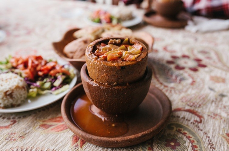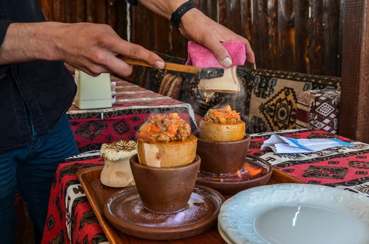 練った小麦粉で蓋をするのですが、どことなくカッパドキアのキノコ岩を想起させます。提供時にはスタッフが壺の上部を割るパフォーマンスをしてくれますよ。これも旅の思い出になりますね◎カッパドキアの名物メニュー、是非ご賞味ください!