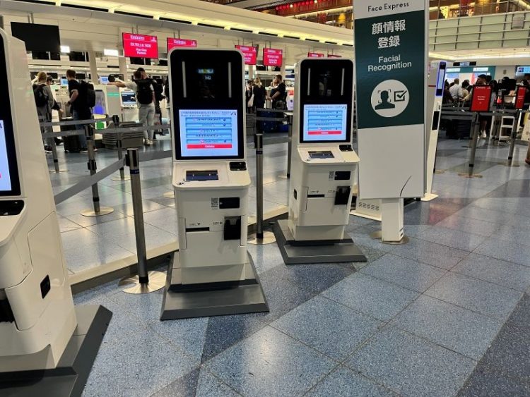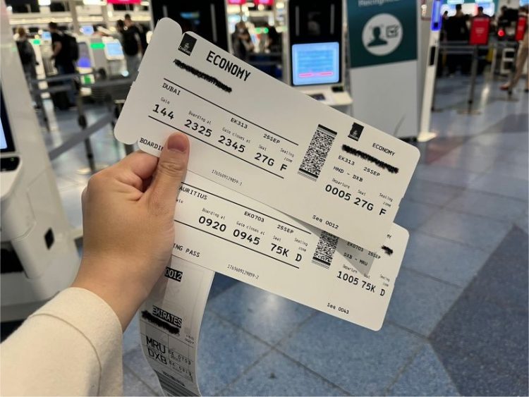 カウンターへ到着するとキオスクが設置されていて、セルフで搭乗券とバゲージタグを発券する手順でした。羽田~ドバイ間だけではなく、ドバイ~モーリシャス間の搭乗券も発券されます。バゲージタグを自分のスーツケースに付けて搭乗券を持ったら有人カウンターへ並びました。少し混んでいたのでこの日は預けるまでに30分ほどかかりました。