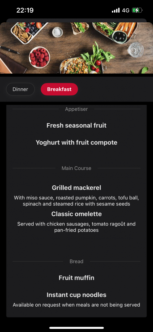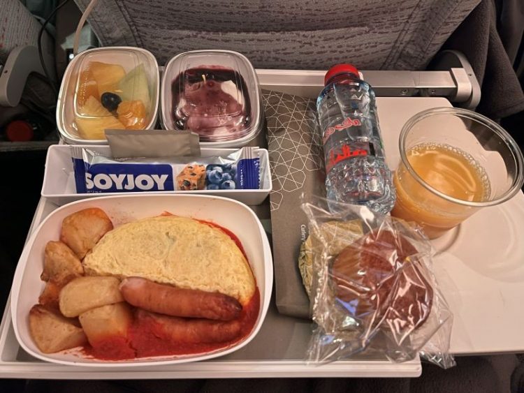 ドバイ着陸の約2時間前には、2回目の機内食が配られました。寝起きでは食欲がなく、フルーツだけいただきました。