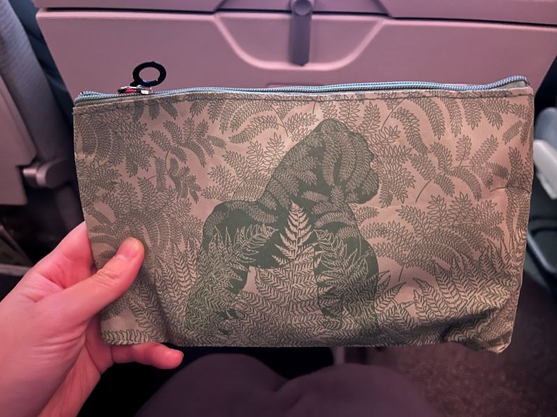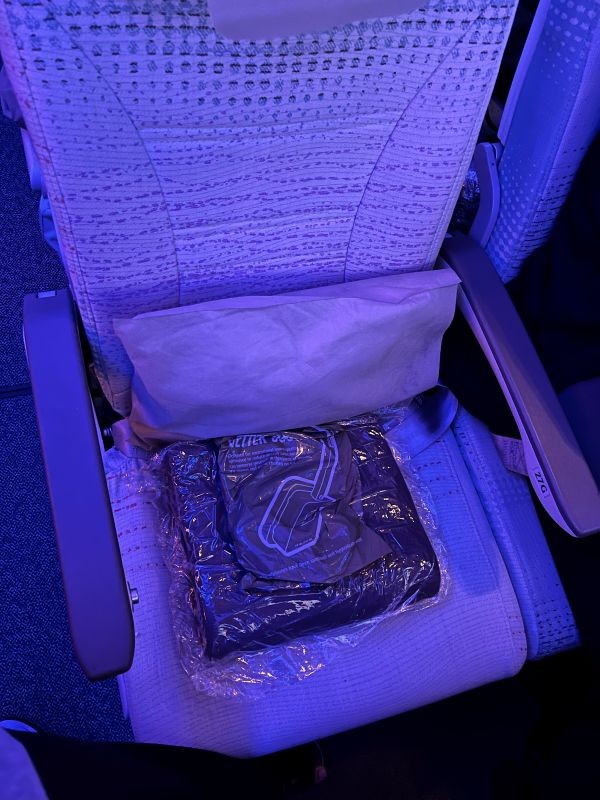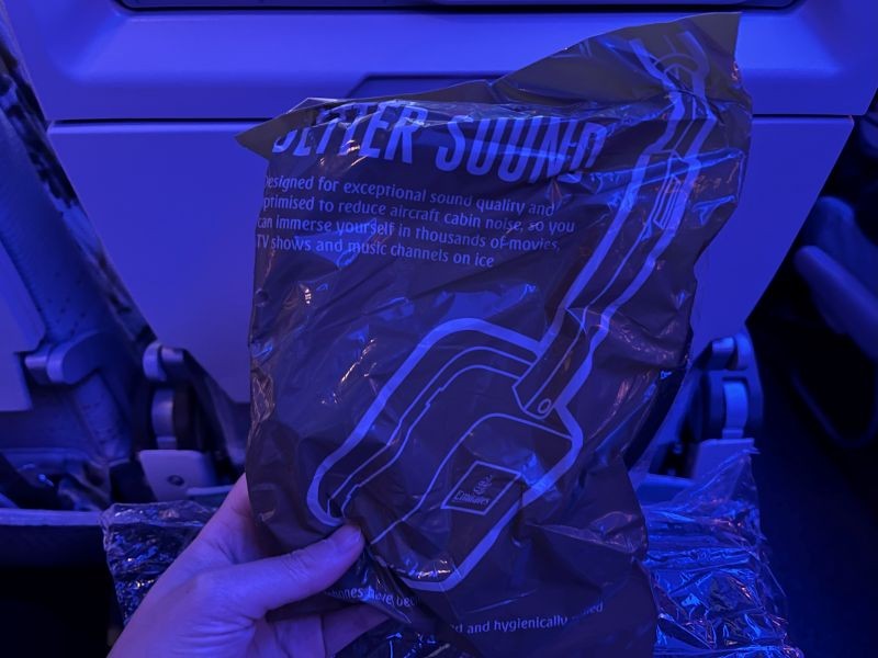 エコノミークラスは、3-4-3の配列です。この日の搭乗率はほぼ100%!オンラインチェックイン時にアプリから通路側の座席を指定しておいて正解でした。アメニティはヘッドフォンと毛布、枕が置いてあり、離陸後に歯ブラシやアイマスクなどが入ったアメニティキットが配られました。また、エコノミークラスでも紙で機内食のメニューが配布されました。